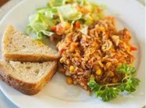 Tilsett den ferdigstekte kjøttdeigen, hermetiske tomater, buljongblandingen, mais, ris og krydder. La koke til risen er ferdig kokt. Ca 20 til 30 min. Spe på med mer vann om du synes den blir for tykk.