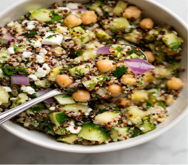 Finn en bolle og rør sammen quinoa, persille, agurk, rødløk, mynte, kikerter, pistasjnøtter sitronsaft, olivenolje. Fetaost smuldres inn. Smak til med salt og pepper.